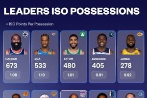 其中哈登单打回合数673次断档领先,亚历山大533次排在第二,第三的则是塔图姆480次。单打回合数4-10名的球员分别是:爱德华兹、詹姆斯、杜兰特、布伦森、德罗赞、欧文、班凯罗。(注:单打回合数、单打每回合平均得分如图)