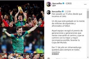 体育资讯7月11日讯 西班牙传奇门将卡西更新社媒动态,回顾15年前的今天赢得世界杯冠军