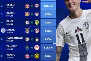 斯洛文尼亚球员历史转会费榜:塞斯科高居榜首,奥布拉克在列